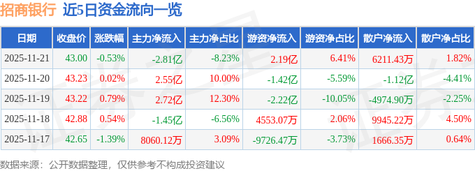 证券之星消息,截至2025年11月21日收盘,招商银行(600036)报收于43.0元,下跌0.53%,换手率0.38%,成交量79.13万手,成交额34.14亿元。