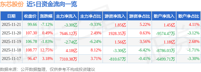 证券之星消息,截至2025年11月21日收盘,东芯股份(688110)报收于99.66元,下跌7.12%,换手率7.83%,成交量34.64万手,成交额35.38亿元。