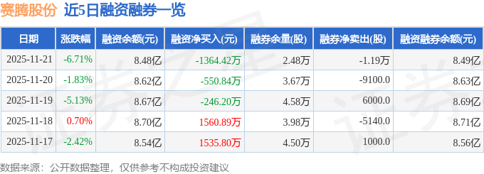 赛腾股份融资融券信息显示,融资方面,当日融资买入6802.42万元,融资偿还8166.83万元,融资净偿还1364.42万元。融券方面,融券卖出400.0股,融券偿还1.23万股,融券余量2.48万股,融券余额101.82万元。融资融券余额8.49亿元。