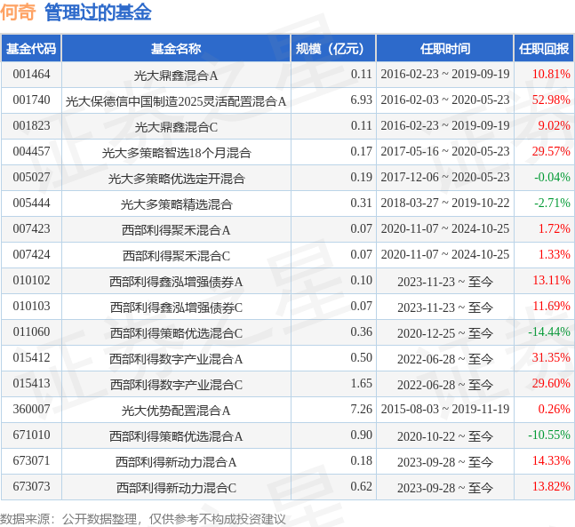 何奇先生:中国国籍,2010年获得武汉大学经济学、法学双学士学位,2012年获得武汉大学经济学硕士学位。于2012年7月至2014年5月在长江证券担任分析师、高级分析师;2014年5月加入光大保德信基金管理有限公司,担任投资研究部研究员、高级研究员,任光大保德信鼎鑫灵活配置混合型证券投资基金基金经理。自2015年8月3日至2019年11月19日任光大保德信优势配置混合型证券投资基金基金经理。2017年12月6日至2020年5月23日任光大保德信多策略优选一年定期开放灵活配置混合型证券投资基金基金经理。2017年5月16日至2020年5月23日任光大保德信多策略智选18个月定期开放混合型证券投资基金基金经理。2016年2月3日至2020年5月23日任光大保德信中国制造2025灵活配置混合型证券投资基金基金经理。2020年6月加入西部利得基金管理有限公司,具有基金从业资格。2020年10月22日任西部利得策略优选混合型证券投资基金基金经理。2020年11月7日至2024年10月25日任西部利得聚禾灵活配置混合型证券投资基金基金经理。2023年9月28日起担任西部利得新动力灵活配置混合型证券投资基金基金经理。2023年11月23日起担任西部利得鑫泓增强债券型证券投资基金基金经理。