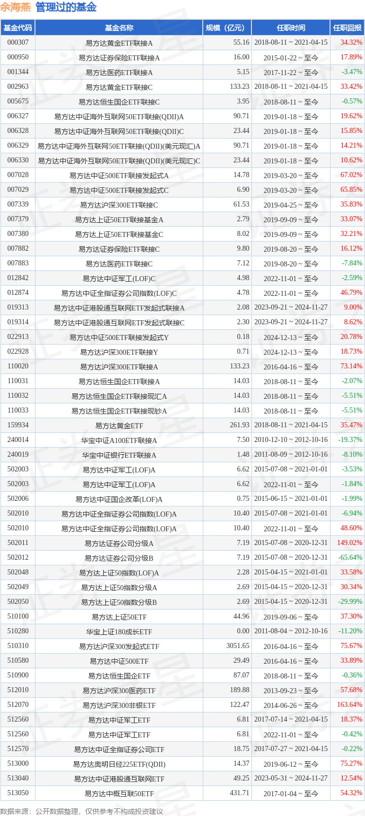 余海燕女士:经济学硕士。曾任汇丰银行Consumer Credit Risk信用风险分析师,华宝兴业基金管理有限公司分析师、基金经理助理、基金经理,易方达基金管理有限公司投资发展部产品经理。担任易方达基金管理有限公司易方达沪深300医药卫生交易型开放式指数证券投资基金基金经理(自2013年9月23日起任职)、易方达沪深300非银行金融交易型开放式指数证券投资基金基金经理(自2014年6月26日起任职)、易方达沪深300非银行金融交易型开放式指数证券投资基金联接基金基金经理(自2015年1月22日起任职)、易方达上证50指数分级证券投资基金基金经理(自2015年4月15日起任职直到2021年1月1日离任)、易方达国企改革指数分级证券投资基金基金经理(自2015年6月15日至2021年1月1日任职)、易方达军工指数分级证券投资基金基金经理(自2015年7月8日至2021年1月1日任职)、易方达证券公司指数分级证券投资基金基金经理(自2015年7月8日起任职直到20211年1月1日离任)、易方达沪深300交易型开放式指数发起式证券投资基金基金经理(自2016年4月16日起任职)、易方达中证500交易型开放式指数证券投资基金基金经理(自2016年4月16日起任职)、易方达沪深300交易型开放式指数发起式证券投资基金联接基金基金经理(自2016年4月16日起任职)、易方达中证海外中国互联网50交易型开放式指数证券投资基金基金经理(自2017年1月4日起任职)、易方达中证军工交易型开放式指数证券投资基金基金经理(自2017年7月14日至2021年4月15日)、易方达中证全指证券公司交易型开放式指数证券投资基金基金经理(自2017年7月27日至2021年4月15日)、易方达沪深300医药卫生交易型开放式指数证券投资基金联接基金基金经理(自2017年11月22日起任职)、易方达黄金交易型开放式证券投资基金联接基金基金经理(自2018年8月11日至2021年4月15日)、易方达恒生中国企业交易型开放式指数证券投资基金联接基金基金经理(自2018年8月11日起任职)、易方达黄金交易型开放式证券投资基金基金经理(自2018年8月11日至2021年4月15日)、易方达恒生中国企业交易型开放式指数证券投资基金基金经理(自2018年8月11日起任职)、易方达中证海外中国互联网50交易型开放式指数证券投资基金联接基金基金经理(自2019年1月18日起任职)、易方达中证500交易型开放式指数证券投资基金发起式联接基金基金经理(自2019年3月20日起任职),易方达日兴资管日经225交易型开放式指数证券投资基金(QDII)基金经理(自2019年6月12日起任职)。2022年11月1日起任易方达中证军工交易型开放式指数证券投资基金、易方达中证军工指数证券投资基金(LOF)基金经理。曾任易方达中证港股通互联网交易型开放式指数证券投资基金、易方达中证港股通互联网交易型开放式指数证券投资基金发起式联接基金基金经理。