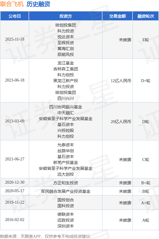 证券之星消息,根据天眼查APP于11月18日公布的信息整理,深圳联合飞机科技有限公司E轮融资,融资额未披露,参与投资的机构包括哈创投集团,科力投资,悦达资本,至辉投资,黄海汇创,辰能风投。