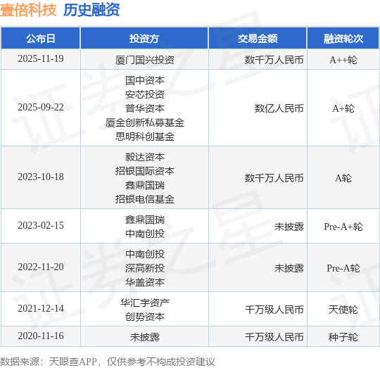 证券之星消息,根据天眼查APP于11月19日公布的信息整理,深圳市壹倍科技有限公司A++轮融资,融资额数千万人民币,参与投资的机构包括厦门国兴投资。