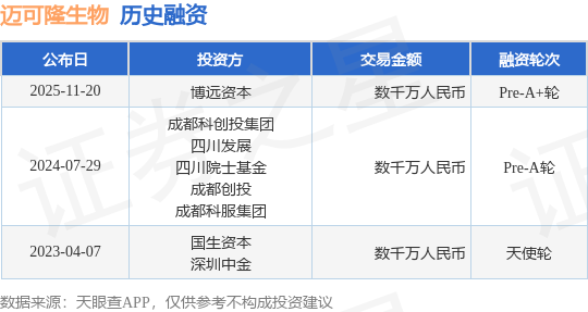 证券之星消息,根据天眼查APP于11月20日公布的信息整理,四川迈可隆生物科技有限公司Pre-A+轮融资,融资额数千万人民币,参与投资的机构包括博远资本。