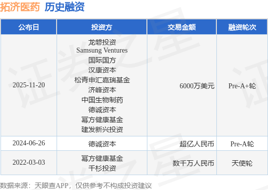 证券之星消息,根据天眼查APP于11月20日公布的信息整理,拓济医药(苏州)有限责任公司Pre-A+轮融资,融资额6000万美元,参与投资的机构包括龙磐投资,Samsung Ventures,国际国方,汉康资本,松青申汇嘉瑞基金,济峰资本,中国生物制药,德诚资本,幂方健康基金,建发新兴投资。