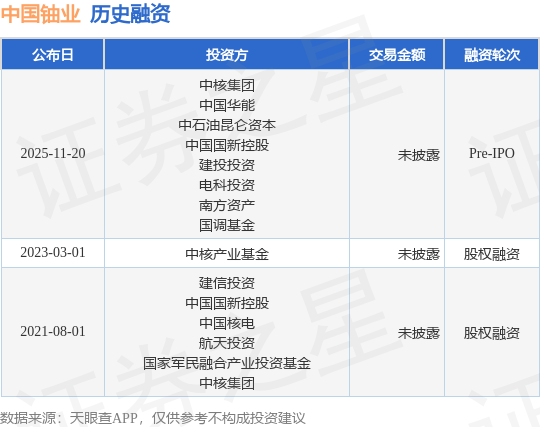 证券之星消息,根据天眼查APP于11月20日公布的信息整理,中国铀业股份有限公司Pre-IPO融资,融资额未披露,参与投资的机构包括中核集团,中国华能,中石油昆仑资本,中国国新控股,建投投资,电科投资,南方资产,国调基金。