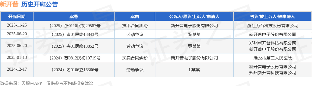 根据统计,近一年内以新开普电子股份有限公司为当事人的历史开庭公告有5则,其中案由为“劳动争议”的公告以3则居首,其次为“买卖合同纠纷”有1则,“技术合同纠纷”有1则。历史开庭公告如下: