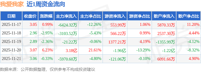 资金流向数据方面,本周我爱我家主力资金合计净流入1.63亿元,游资资金合计净流出1.72亿元,散户资金合计净流入898.95万元。本周资金流向一览见下表: