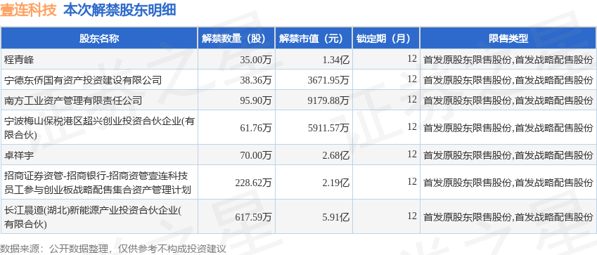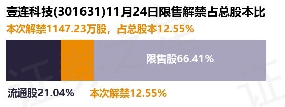 证券之星消息,根据市场公开信息整理,壹连科技(301631)于11月24日将有1147.23万股限售股份解禁,为公司首发原股东限售股份,首发战略配售股份,占公司总股本12.55%。(本次数据根据历史公告整理得出,实际情况以上市公司最新公告为准)最近一年内,该股累计解禁70.97万股,占总股本的0.78%。本次解禁后,公司还有6070.91万股限售股份,占总股本66.41%。具体如下图所示: