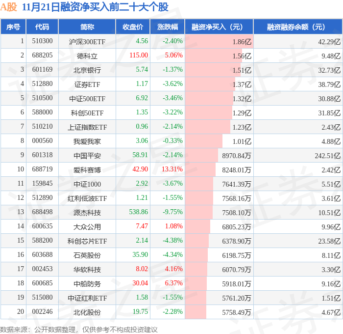 A股融资净买入前三分别为:沪深300ETF(510300)融资净买入1.86亿元、德科立(688205)融资净买入1.56亿元、北京银行(601169)融资净买入1.51亿元,前20具体见下表: