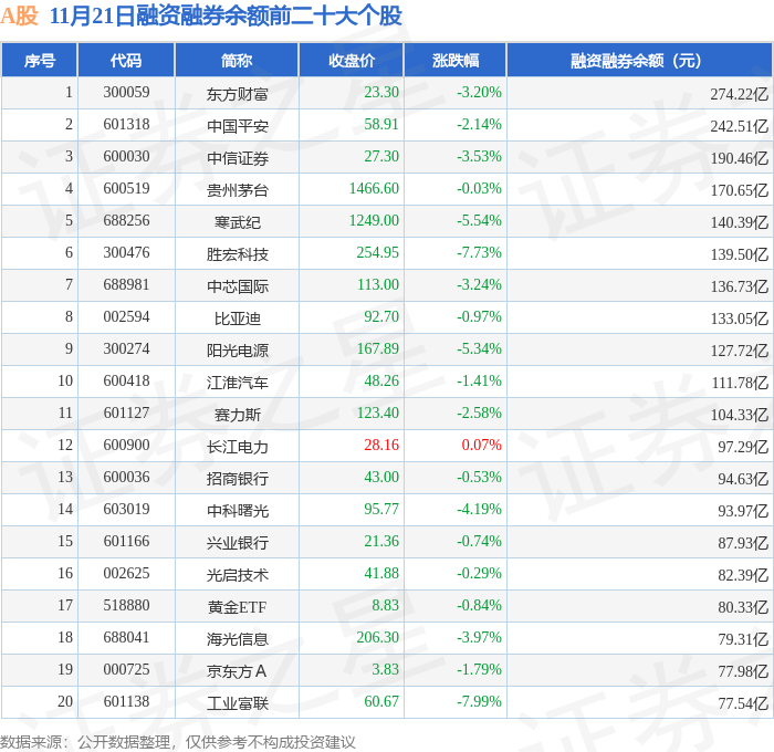 A股融资融券余额前三分别为:东方财富(300059)融资融券余额274.22亿元、中国平安(601318)融资融券余额242.51亿元、中信证券(600030)融资融券余额190.46亿元,前20具体见下表: