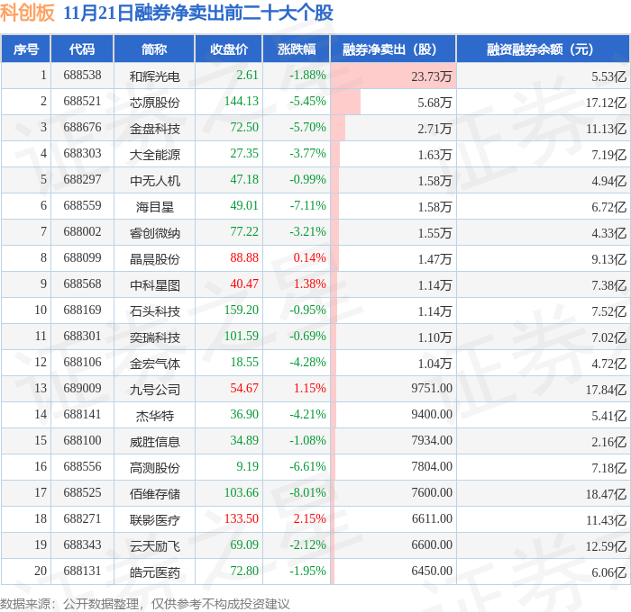 科创板融券净卖出前三分别为:和辉光电(688538)融券净卖出23.73万股、芯原股份(688521)融券净卖出5.68万股、金盘科技(688676)融券净卖出2.71万股,前20具体见下表: