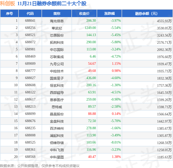 科创板融券余额前三分别为:海光信息(688041)融券余额4555.93万元、寒武纪(688256)融券余额3530.05万元、芯原股份(688521)融券余额3243.56万元,前20具体见下表: