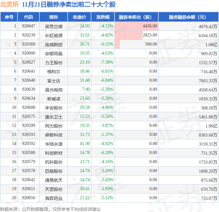 北交所融券净卖出前三分别为:诺思兰德(920047)融券净卖出4436股、长虹能源(920239)融券净卖出2823股、连城数控(920368)融券净卖出500股,前20具体见下表: