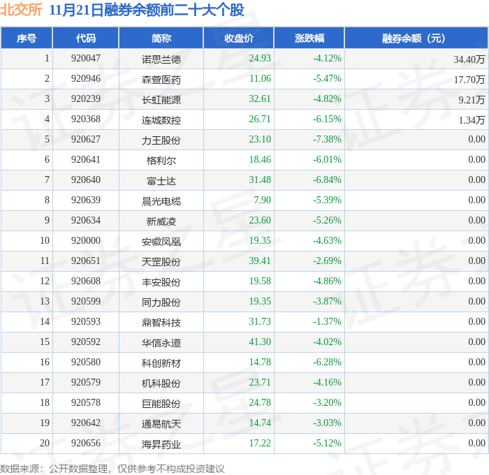 北交所融券余额前三分别为:诺思兰德(920047)融券余额34.4万元、森萱医药(920946)融券余额17.7万元、长虹能源(920239)融券余额9.21万元,前20具体见下表: