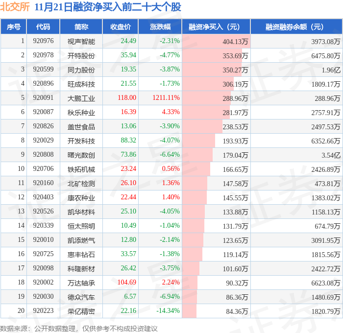 北交所融资净买入前三分别为:视声智能(920976)融资净买入404.13万元、开特股份(920978)融资净买入353.69万元、同力股份(920599)融资净买入350.27万元,前20具体见下表: