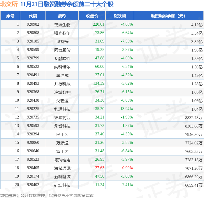 北交所融资融券余额前三分别为:锦波生物(920982)融资融券余额4.12亿元、曙光数创(920808)融资融券余额3.54亿元、贝特瑞(920185)融资融券余额3.32亿元,前20具体见下表: