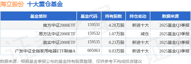 根据2025基金Q3季报公募基金重仓股数据,重仓该股的公募基金共4家,其中持有数量最多的公募基金为南方基金的南方中证2000ETF。南方中证2000ETF目前规模为5.43亿元,最新净值1.2775(11月21日),较上一交易日下跌3.98%,近一年上涨21.81%。该公募基金现任基金经理为李佳亮。李佳亮在任的基金产品包括:南方MSCI中国A50互联互通ETF,管理时间为2021年10月29日至今,期间收益率为1.98%;南方MSCI中国A50互联互通ETF联接A,管理时间为2022年1月10日至今,期间收益率为11.62%;南方北证50成份指数发起A,管理时间为2022年12月23日至今,期间收益率为27.34%;南方中证主要消费ETF,管理时间为2023年3月3日至今,期间收益率为-21.72%。