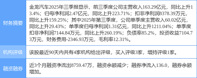 2025年11月1日,东吴证券研究员黄细里,孙仁昊发布了对金龙汽车的研报《2025年三季报点评:25Q3毛利率同环比持续提升,业绩超预期》,该研报对金龙汽车给出“买入”评级。证券之星数据中心根据近三年发布的研报数据计算,该研报作者对此股的盈利预测准确度为55.93%。