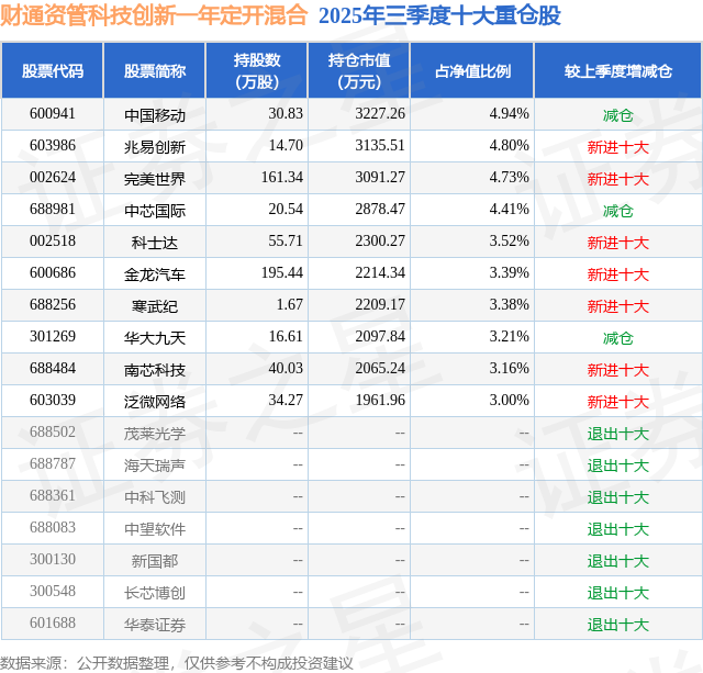 根据2025基金Q3季报公募基金重仓股数据,重仓该股的公募基金共2家,其中持有数量最多的公募基金为财通资管的财通资管科技创新一年定开混合。财通资管科技创新一年定开混合目前规模为6.53亿元,最新净值1.4265(11月21日),较上一交易日下跌4.11%,近一年上涨22.28%。该公募基金现任基金经理为包斅文 邓芳程。包斅文在任的基金产品包括:财通资管数字经济混合发起式A,管理时间为2022年12月26日至今,期间收益率为78.0%;财通资管创新成长混合A,管理时间为2024年3月26日至今,期间收益率为63.7%。
