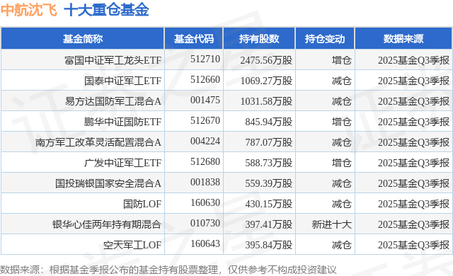 根据2025基金Q3季报公募基金重仓股数据,重仓该股的公募基金共192家,其中持有数量最多的公募基金为富国基金的富国中证军工龙头ETF。富国中证军工龙头ETF目前规模为146.9亿元,最新净值0.6546(11月21日),较上一交易日下跌1.65%,近一年上涨0.63%。该公募基金现任基金经理为王乐乐 牛志冬。王乐乐在任的基金产品包括:富国中证消费50ETF,管理时间为2019年10月14日至今,期间收益率为19.74%;富国中证科技50策略ETF,管理时间为2019年11月15日至今,期间收益率为67.36%;富国中证科技50策略ETF联接A,管理时间为2020年2月20日至今,期间收益率为27.16%。牛志冬在任的基金产品包括:富国中证移动互联网指数(LOF)A,管理时间为2015年5月13日至今,期间收益率为-12.1%;富国中证医药主题指数增强A,管理时间为2016年11月11日至今,期间收益率为41.03%;富国中证娱乐主题指数增强(LOF)A,管理时间为2017年3月13日至今,期间收益率为-24.91%;