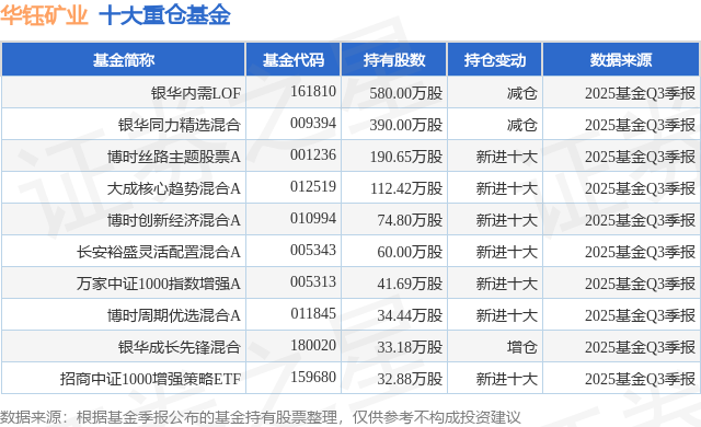 根据2025基金Q3季报公募基金重仓股数据,重仓该股的公募基金共26家,其中持有数量最多的公募基金为银华基金的银华内需LOF。银华内需LOF目前规模为17.2亿元,最新净值3.628(11月21日),较上一交易日下跌4.25%,近一年上涨38.69%。该公募基金现任基金经理为刘辉 王利刚。刘辉在任的基金产品包括:银华同力精选混合,管理时间为2020年6月16日至今,期间收益率为15.83%;银华创业板两年定期开放混合,管理时间为2020年8月7日至今,期间收益率为-27.04%。王利刚在任的基金产品包括:银华成长先锋混合,管理时间为2019年12月31日至今,期间收益率为14.52%;银华创业板两年定期开放混合,管理时间为2020年8月7日至今,期间收益率为-27.04%;银华同力精选混合,管理时间为2021年4月26日至今,期间收益率为16.98%;