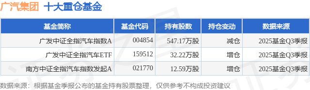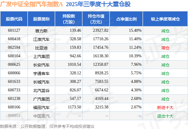 根据2025基金Q3季报公募基金重仓股数据,重仓该股的公募基金共3家,其中持有数量最多的公募基金为广发基金的广发中证全指汽车指数A。广发中证全指汽车指数A目前规模为7.85亿元,最新净值1.7341(11月21日),较上一交易日下跌1.87%,近一年下跌1.57%。该公募基金现任基金经理为陆志明。陆志明在任的基金产品包括:广发中证全指建筑材料指数A,管理时间为2021年6月17日至今,期间收益率为-37.95%;广发中证全指家用电器ETF联接A,管理时间为2021年6月17日至今,期间收益率为6.9%;广发上证科创板50成份ETF,管理时间为2021年7月15日至今,期间收益率为-18.1%。