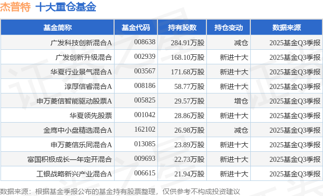 根据2025基金Q3季报公募基金重仓股数据,重仓该股的公募基金共31家,其中持有数量最多的公募基金为广发基金的广发科技创新混合A。广发科技创新混合A目前规模为31.41亿元,最新净值2.089(11月21日),较上一交易日下跌6.42%,近一年上涨26.15%。该公募基金现任基金经理为吴远怡。吴远怡在任的基金产品包括:广发创新升级混合,管理时间为2020年9月30日至今,期间收益率为-25.52%;广发北交所精选两年定开混合A,管理时间为2021年11月23日至今,期间收益率为67.08%;广发价值核心混合A,管理时间为2022年11月1日至今,期间收益率为74.39%。