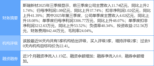 今日斯瑞新材(688102)涨14.11%,收盘报24.99元。