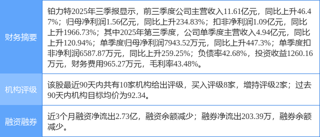 2025年11月7日,中航证券研究员邓轲,王勇杰发布了对铂力特的研报《2025Q3点评:行业拐点已现》,该研报对铂力特给出“买入”评级。研报中预计2025-2027年公司实现营业收入18.25亿元、25.27亿元、34.62亿元,同比增长37.66%、38.50%、36.98%,实现归母净利2.3亿元、3.2亿元、4.3亿元,同比增长120.0%、39.8%、34.3%,对应PE87X、62X、46X,维持“买入”评级。证券之星数据中心根据近三年发布的研报数据计算,该研报作者对此股的盈利预测准确度为15.59%。