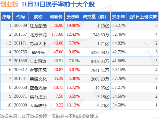 当日创业板换手率前10大个股中9只个股收涨,平均涨幅9.89%,其中江龙船艇(300589)以换手率55.21%排第一,8只个股近5个交易日中多次上榜。