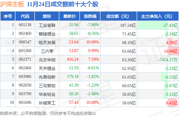 当日沪深主板成交额前10大个股中4只个股收涨,平均涨幅9.39%,其中工业富联(601138)以成交额187.24亿元排第一。从主力资金流入看,成交额前10大个股中有3只个股呈现主力资金净流入。