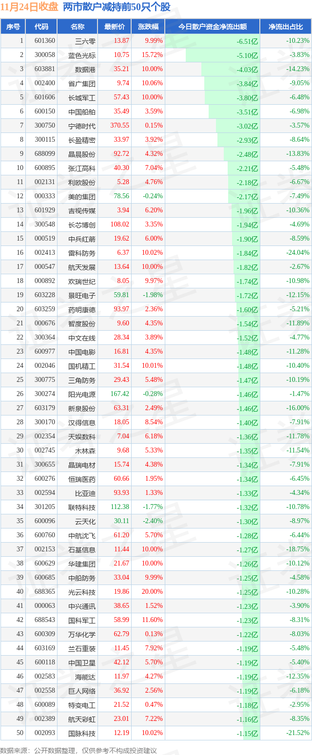 两市散户减持最多的前十只个股为: