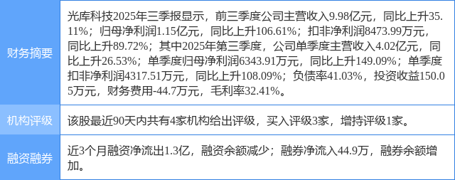 2025年10月27日,民生证券研究员马佳伟,朱正卿发布了对光库科技的研报《2025年三季度报点评:Q3业绩持续增长,光通讯业务受益AI发展》,该研报对光库科技给出“买入”评级。研报中预计公司2025~2027年营业收入有望分别达13.37亿元、17.30亿元、22.35亿元,归母净利润有望分别达1.15亿元、1.65亿元、2.24亿元,对应PE分别为244/171/125X,我们认为行业高速发展的同时公司有望凭借自身技术优势快速成长,维持“推荐”评级。证券之星数据中心根据近三年发布的研报数据计算,该研报作者对此股的盈利预测准确度为29.56%。