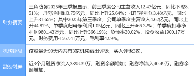 2025年10月28日,东吴证券研究员苏立赞,许牧,高正泰发布了对三角防务的研报《2025年三季报点评:产能爬坡完成、盈利质量修复、现金蓄势待发》,该研报对三角防务给出“买入”评级。研报中预计公司2025-2027年归母净利润分别为4.59/5.71/5.96亿元,对应PE分别为31/25/24倍,维持“买入”评级。证券之星数据中心根据近三年发布的研报数据计算,该研报作者对此股的盈利预测准确度为37.88%。