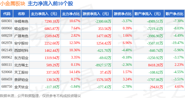 从资金流向上来看,当日小金属板块主力资金净流出1.67亿元,游资资金净流入1672.34万元,散户资金净流入1.5亿元。小金属板块个股资金流向见下表: