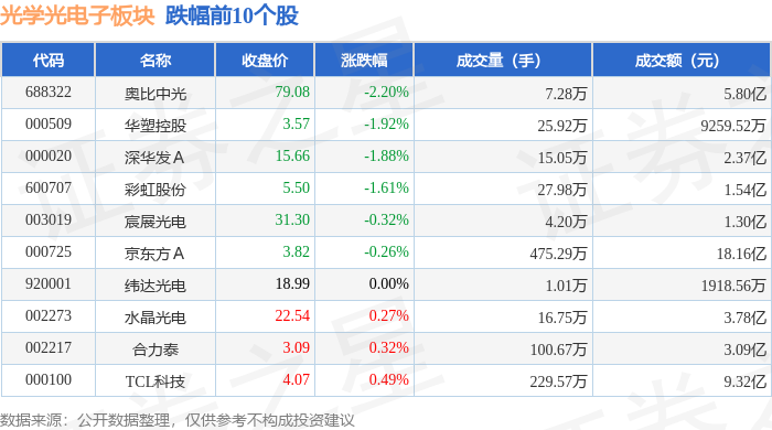 从资金流向上来看,当日光学光电子板块主力资金净流入2.39亿元,游资资金净流出2.69亿元,散户资金净流入2989.98万元。光学光电子板块个股资金流向见下表: