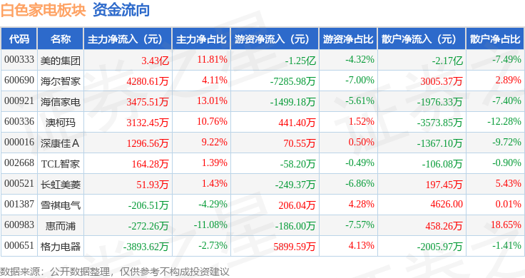 从资金流向上来看,当日白色家电板块主力资金净流入4.23亿元,游资资金净流出1.52亿元,散户资金净流出2.71亿元。白色家电板块个股资金流向见下表: