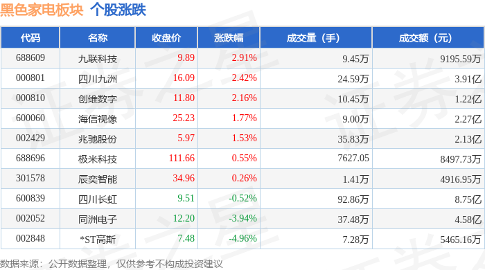从资金流向上来看,当日黑色家电板块主力资金净流出2.51亿元,游资资金净流出417.25万元,散户资金净流入2.56亿元。黑色家电板块个股资金流向见下表: