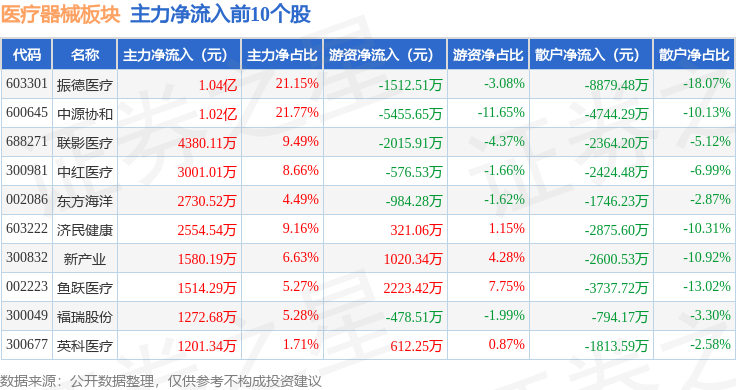从资金流向上来看,当日医疗器械板块主力资金净流入7773.53万元,游资资金净流出2.02亿元,散户资金净流入1.25亿元。医疗器械板块个股资金流向见下表: