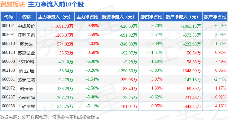从资金流向上来看,当日贸易板块主力资金净流出5481.09万元,游资资金净流出2418.9万元,散户资金净流入7899.99万元。贸易板块个股资金流向见下表: