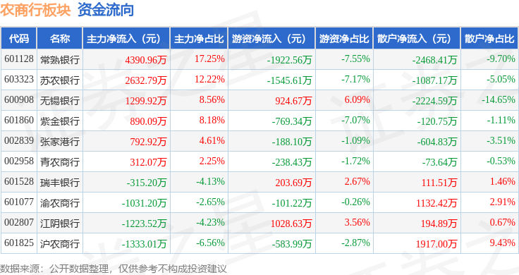 从资金流向上来看,当日农商行板块主力资金净流入6415.83万元,游资资金净流出3192.27万元,散户资金净流出3223.56万元。农商行板块个股资金流向见下表: