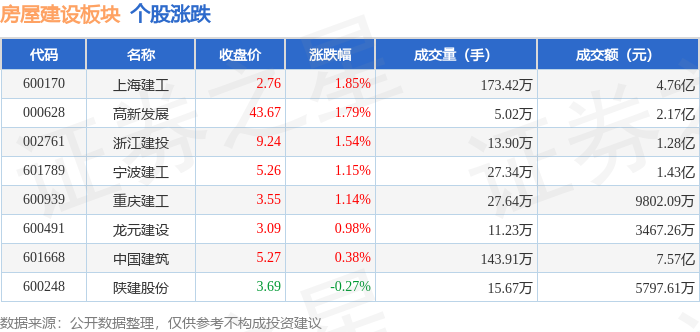 证券之星消息,11月24日房屋建设板块较上一交易日上涨0.59%,上海建工领涨。当日上证指数报收于3836.77,上涨0.05%。深证成指报收于12585.08,上涨0.37%。房屋建设板块个股涨跌见下表: