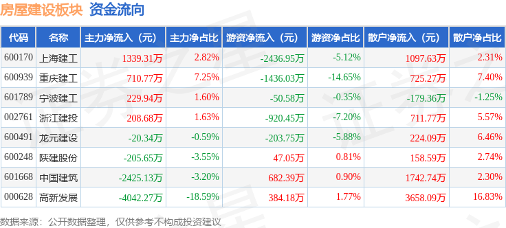 从资金流向上来看,当日房屋建设板块主力资金净流出4204.69万元,游资资金净流出3934.14万元,散户资金净流入8138.83万元。房屋建设板块个股资金流向见下表: