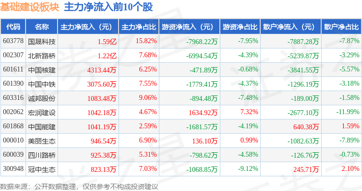 从资金流向上来看,当日基础建设板块主力资金净流入2.46亿元,游资资金净流出2.12亿元,散户资金净流出3457.51万元。基础建设板块个股资金流向见下表: