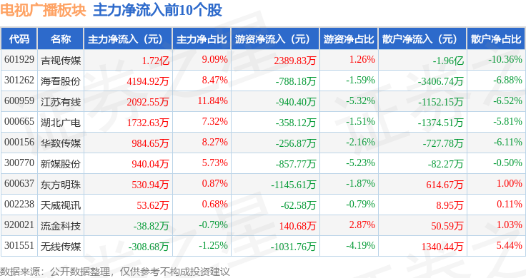 从资金流向上来看,当日电视广播板块主力资金净流入2.1亿元,游资资金净流出6607.86万元,散户资金净流出1.44亿元。电视广播板块个股资金流向见下表: