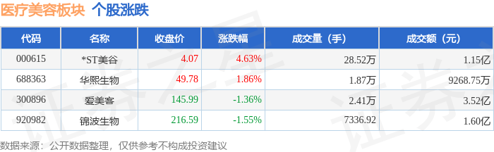 证券之星消息,11月24日医疗美容板块较上一交易日上涨0.27%,*ST美谷领涨。当日上证指数报收于3836.77,上涨0.05%。深证成指报收于12585.08,上涨0.37%。医疗美容板块个股涨跌见下表: