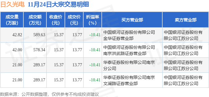证券之星消息,11月24日日久光电发生大宗交易,交易数据如下:
