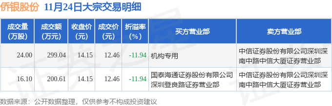 证券之星消息,11月24日侨银股份发生大宗交易,交易数据如下: