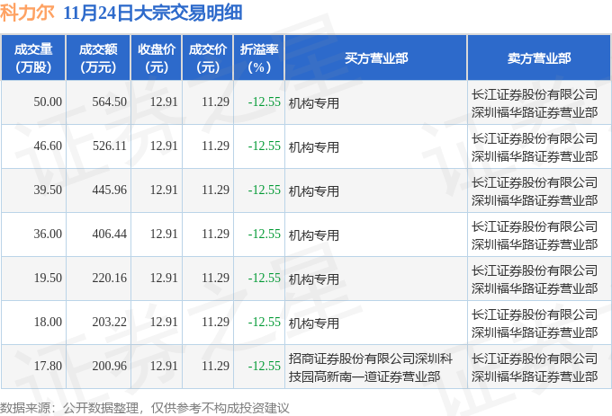 证券之星消息,11月24日科力尔发生大宗交易,交易数据如下: